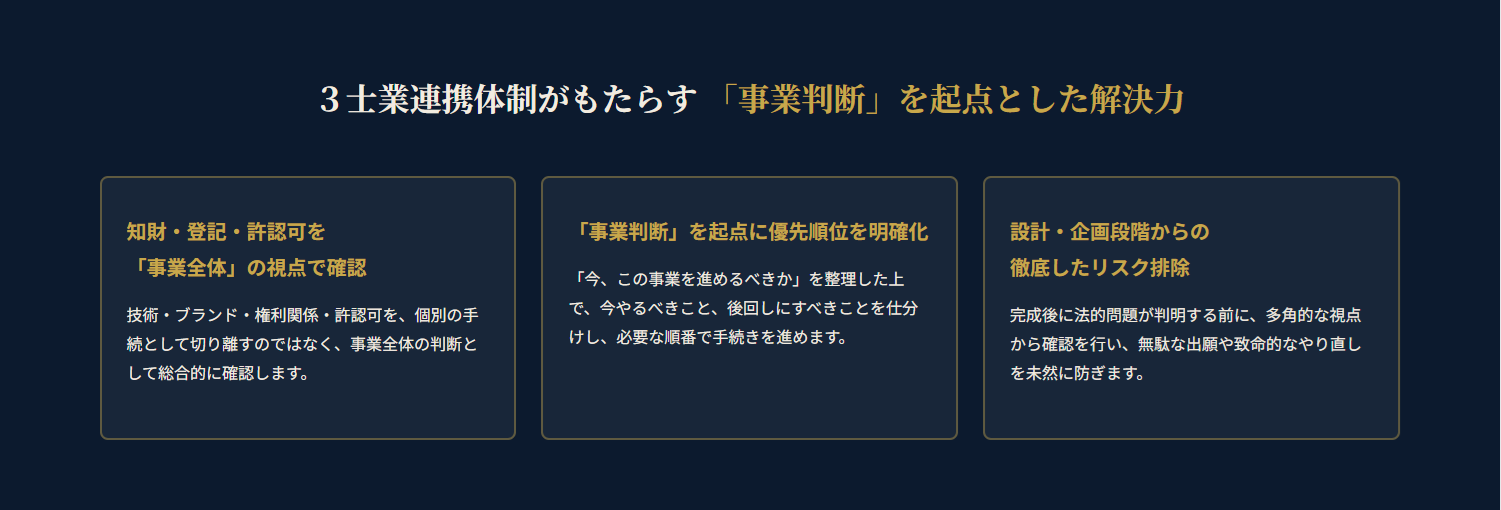 強み① 知財・登記・許認可を 事業全体の判断として確認